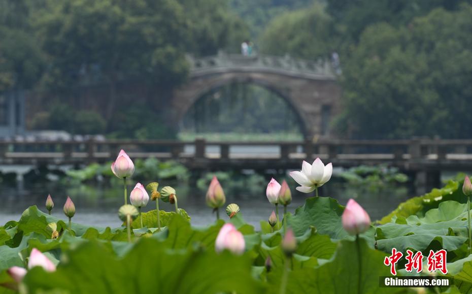 江南夏日,浙江杭州西湖十景之一曲院风荷景点内,大片荷叶荷花密集生长开放,独特景致吸引游人。王刚 摄
