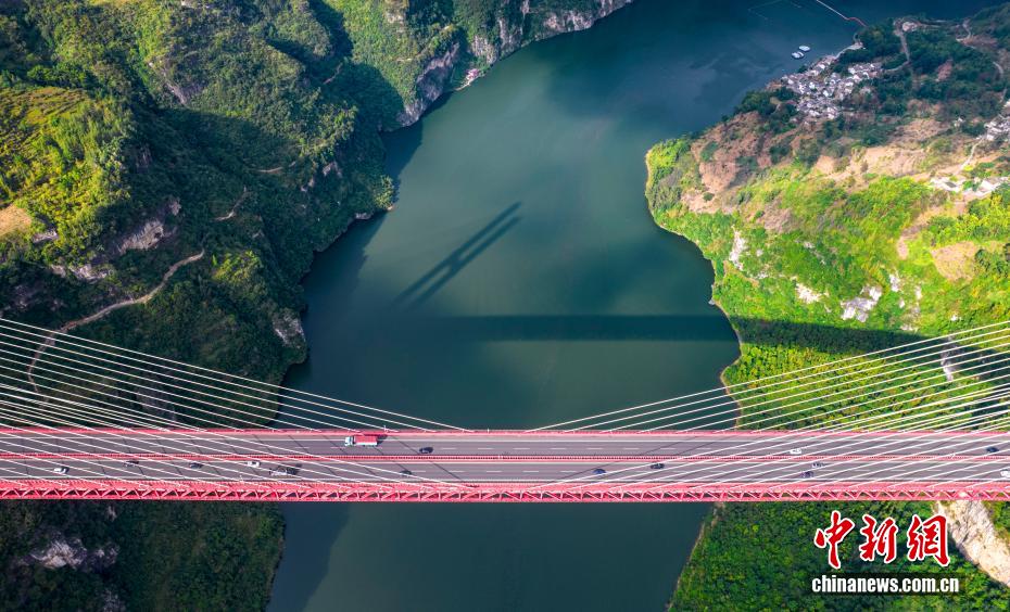 10月8日,国庆中秋假期的最后一天,贵州省贵黔高速公路鸭池河大桥迎来返程车流高峰,大桥上的车流与河流、峡谷交相辉映,壮美如画。图为10月8日,车辆行驶在贵州省贵(阳)黔(西)高速公路鸭池河大桥上。(无人机照
