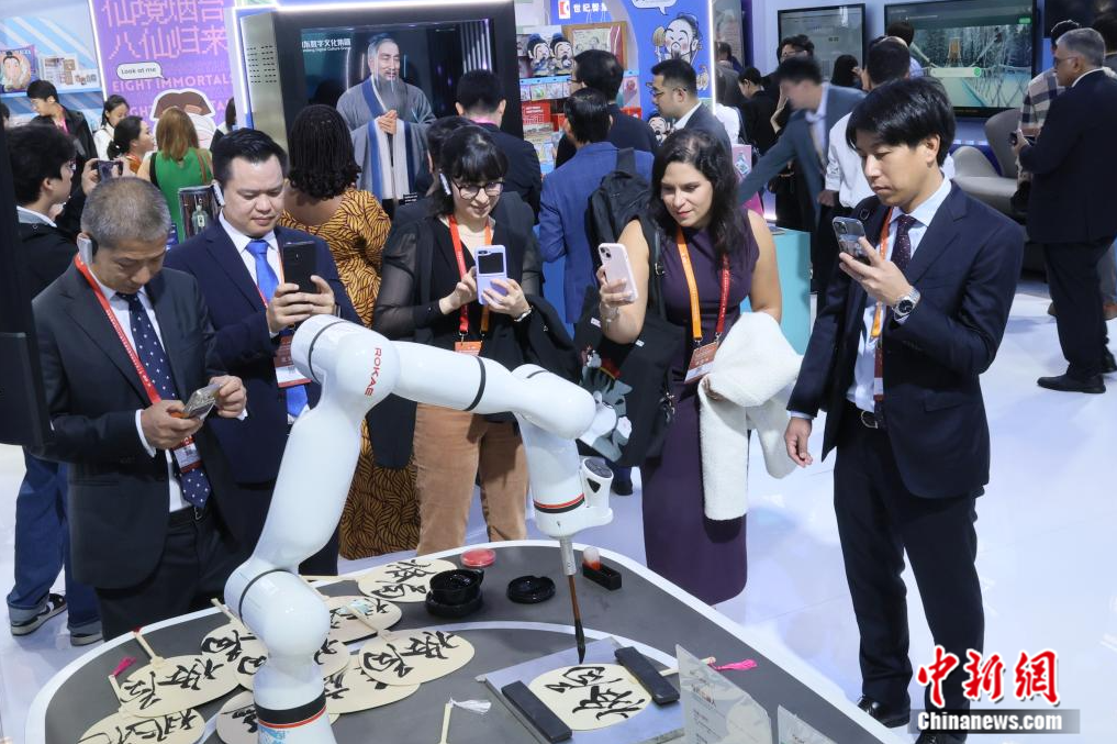 10月16日,第十届中国国际版权博览会在山东青岛举行,以“数智引领未来·版权创新发展”为主题,吸引了1100余家参展单位,创历史之最。图为外方参会嘉宾观看机器人写毛笔字。 中新社发 张孝鹏 摄