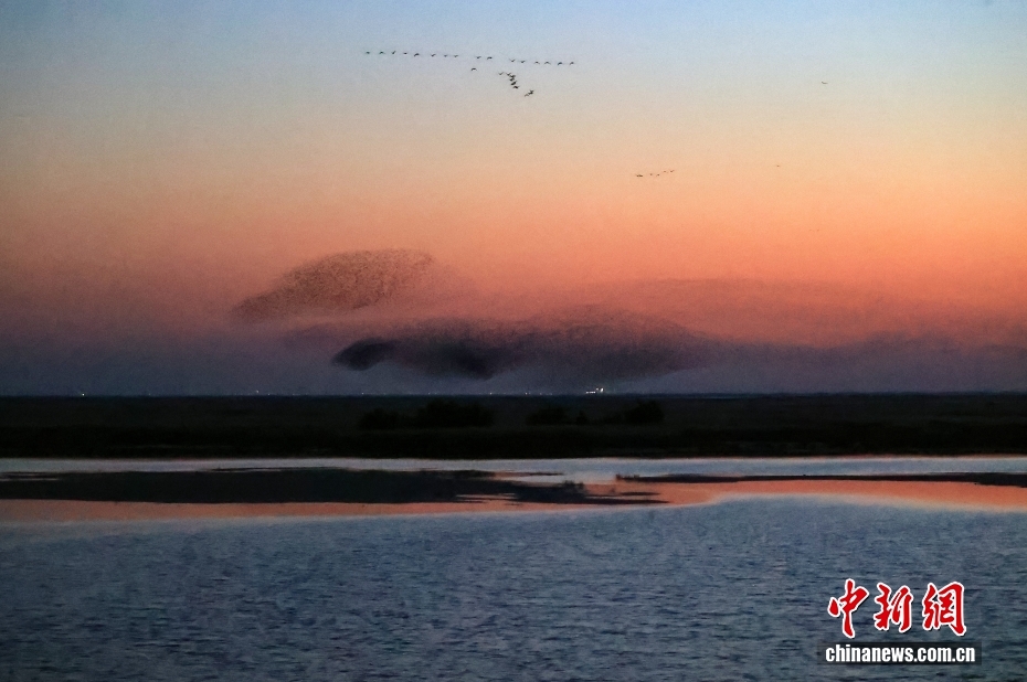 11月19日傍晚,黄河口湿地上空上演鸟浪景观,让人叹为观止。近日,在位于山东省东营市的山东黄河三角洲国家级自然保护区湿地上空,每天都会呈现“鸟浪”壮观景象。数万只花脸鸭腾空飞起,时而扶摇直上,时而俯冲直下,阵型瞬息万变。