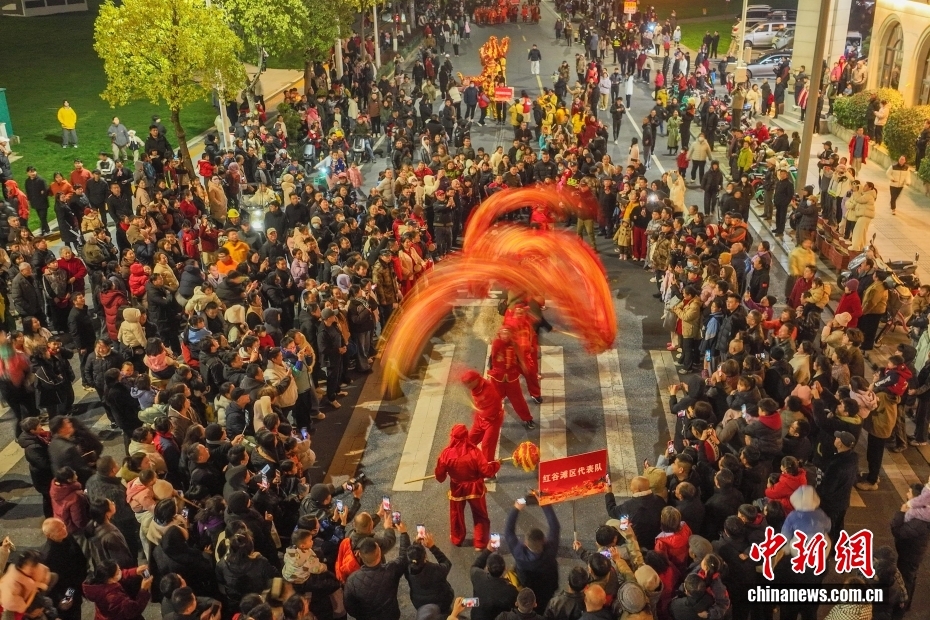 3月2日,元宵节前夕,“龙腾狮跃”迎新年巡游活动在江西南昌湾里管理局举行,夜色之中,一条条龙灯、板灯龙翩翩起舞,采莲船、媒婆、蚌壳精、渔夫、挑花篮、南狮、扇子舞等民俗轮番上演,吸引了众多民众沿街观看。图为巡游现场,精彩的表演吸引众多民众沿街观看。(无人机照片)