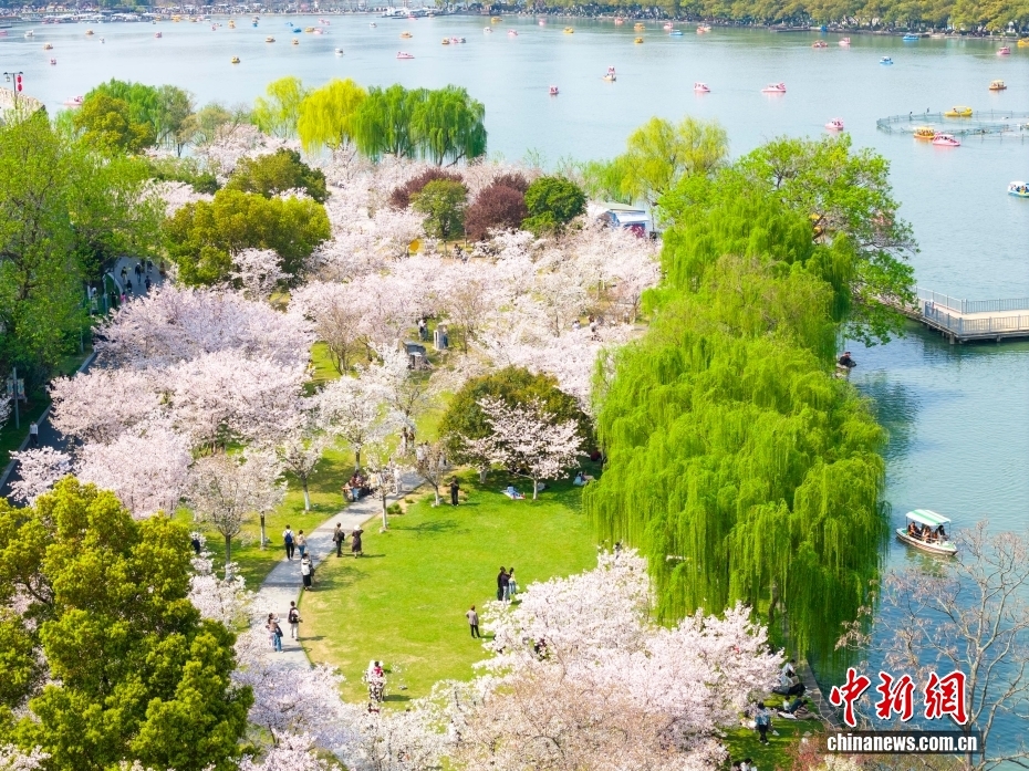 3月29日,江苏南京玄武湖公园内樱花竞相绽放,如云似霞,吸引众多游客前来踏青赏花,乐享春光。图/CNSphoto 史俊 摄