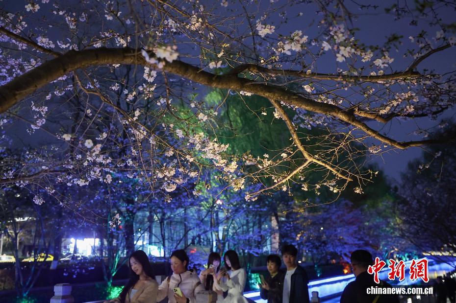 3月23日晚,江苏南京,太平北路珍珠河畔樱花盛开,成为夜色中的独特风景。中新社记者 泱波 摄