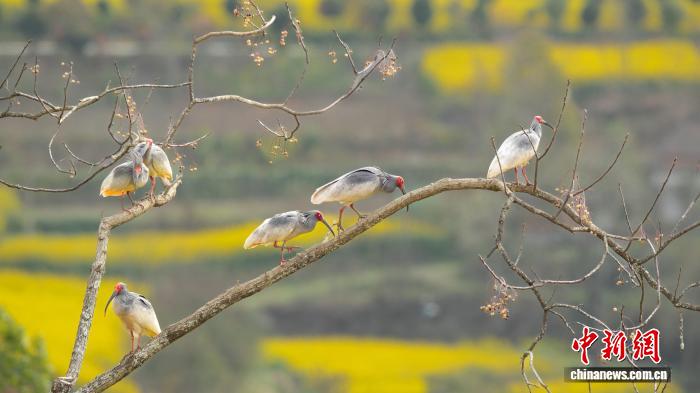 近日,“朱鹮之乡”陕西省汉中市洋县春意盎然,朱鹮或在花间翩然飞过,或在花田枝头栖息,构成一幅和谐美好的生态画卷。图为朱鹮在树枝上栖息。刘齐轩 摄