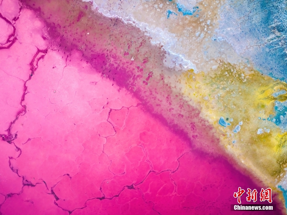 内蒙古阿拉善盟,巴丹吉林沙漠里的红色盐湖——红海子,呈现出五颜六色的自然奇观。图为无人机航拍的色彩景观。