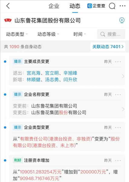 企查查显示,6月30日,中国食用油龙头企业山东鲁花集团有限公司(下称“鲁花集团”)完成股改,公司名称变更为山东鲁花集团股份有限公司,注册资本从约10.91亿元增至20亿元。