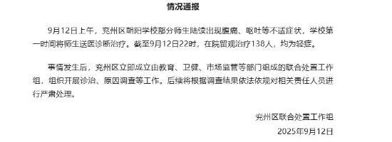 9月12日上午,济宁市兖州区朝阳学校多名师生出现腹痛、呕吐等不适症状,校方随即组织送医救治。次日凌晨,官方通报,截至事发当日22时,共有138人在院留观治疗,均为轻症。
