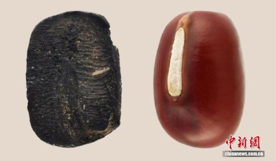 小高遗址出土的炭化小豆(左)与现代小豆样品。受访者供图