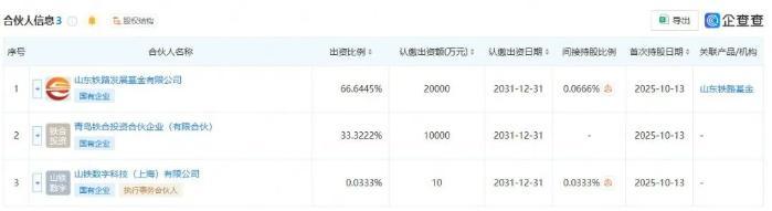 第三大合伙人为山铁数字(上海),认缴出资额10万元。尽管出资额相对较少,但山铁数字(上海)的背景不容小觑。