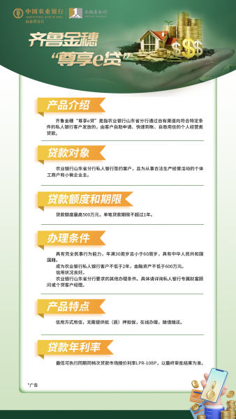 齐鲁金穗“尊享e贷”是指农业银行山东省分行通过自有渠道向符合特定条件的私人银行客户发放的,由客户自助申请、快速到账、自助用信的个人经营类贷款。