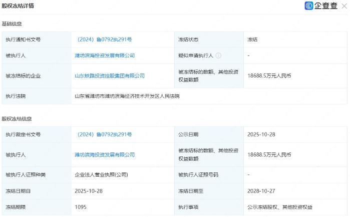 潍坊滨海经济技术开发区人民法院执行通知文书(2024)鲁0792执291号显示,因股东之一潍坊滨海投资发展有限公司成为被执行人,山东铁路投资控股集团有限公司(简称“山东铁投集团”)被冻结股权,股权数额18688.5万元。