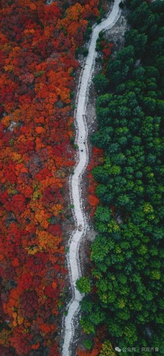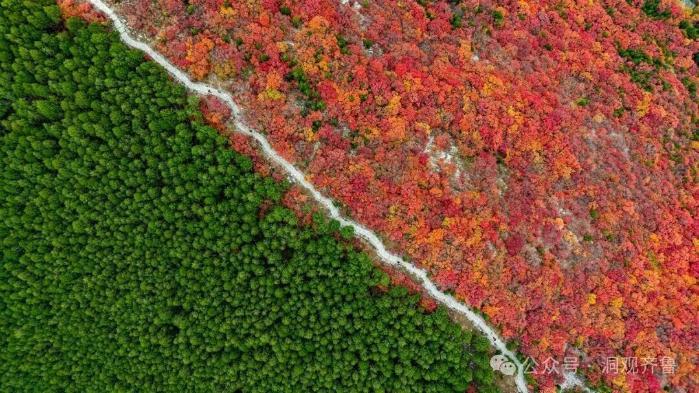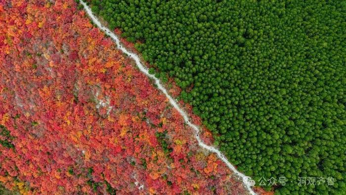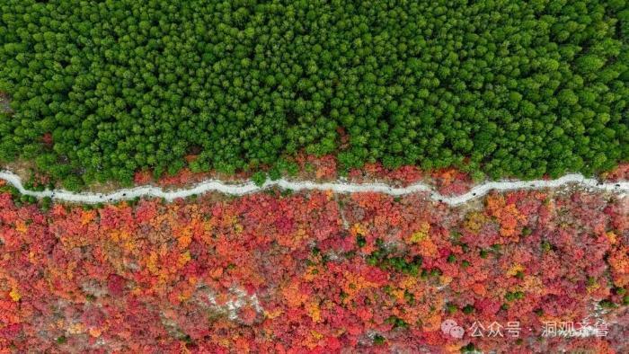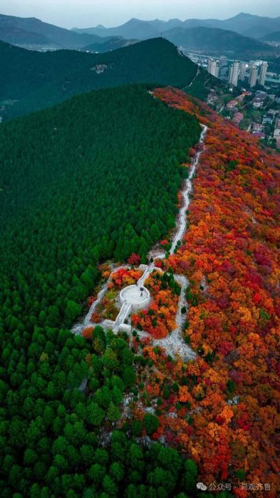 济南蝎子山形似翘尾蝎子,静卧在城市脉络中。山脊天然划界,将秋意一分为二,北坡松柏叠翠,南坡黄栌燃红,航拍视角下,蝎子山就像一锅煮沸的秋日“鸳鸯锅”,每一帧都是壁纸。