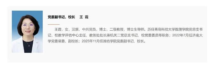 近日,潍坊学院更新现任领导信息,王霞已任潍坊学院党委副书记、校长。