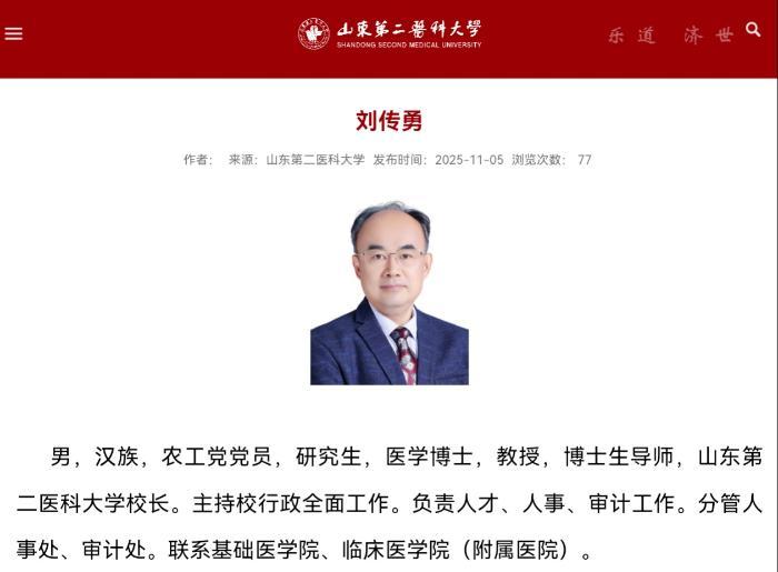 近日,山东第二医科大学网站更新领导显示,刘传勇已任山东第二医科大学校长。