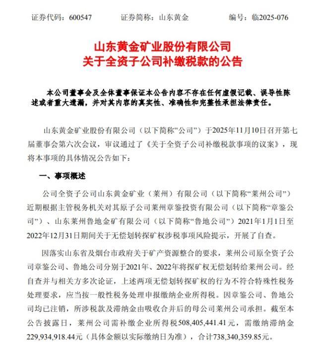 11月10日,山东黄金发布公告,全资子公司山东黄金矿业(莱州)有限公司(简称“莱州公司”)需补缴企业所得税5.08亿元,滞纳金2.3亿元,合计7.38亿元。
