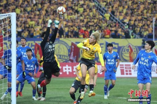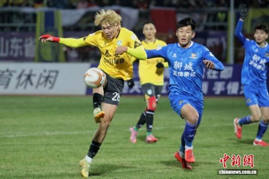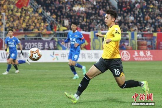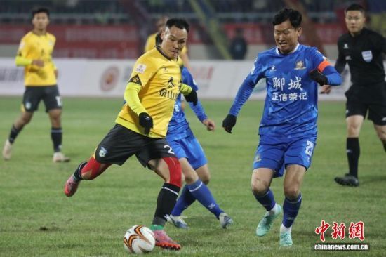 11月23日,山东泰安,2025年山东省齐鲁足球超级联赛(鲁超)决赛,泰山城建队与聊城传奇队球员正在比赛中。据了解,双方首回合0:0战平,今日泰山城建队主场2:1战胜聊城传奇,泰山城建队总分2:1夺冠。中新社发 陈阳 摄