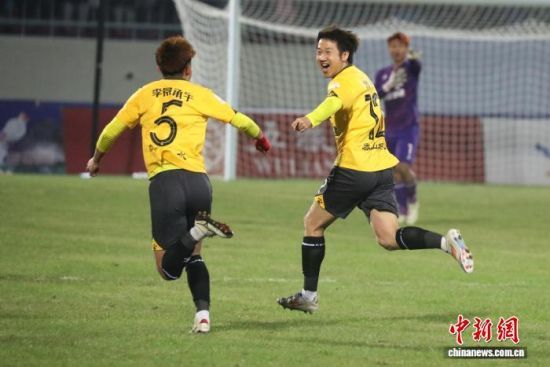 11月23日,山东泰安,2025年山东省齐鲁足球超级联赛(鲁超)决赛,泰山城建队队员庆祝进球。据了解,双方首回合0:0战平,今日泰山城建队主场2:1战胜聊城传奇,泰山城建队总分2:1夺冠。中新社发 陈阳 摄