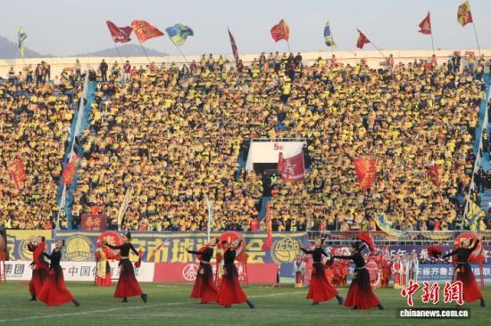 11月23日,山东泰安,2025年山东省齐鲁足球超级联赛(鲁超)决赛,观众观看演出。据了解,双方首回合0:0战平,今日泰山城建队主场2:1战胜聊城传奇,泰山城建队总分2:1夺冠。中新社发 陈阳 摄
