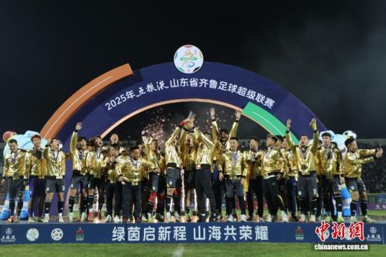 11月23日,山东泰安,2025年山东省齐鲁足球超级联赛(鲁超)颁奖仪式,泰山城建队夺冠。据了解,双方首回合0:0战平,今日泰山城建队主场2:1战胜聊城传奇,泰山城建队总分2:1夺冠。中新社发 陈阳 摄