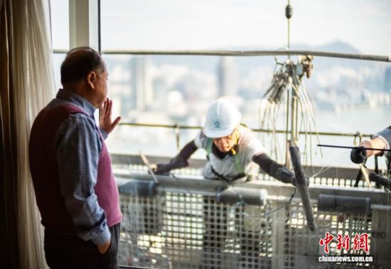 11月21日,知名作家、诺贝尔文学奖得主莫言在香港接受中新社记者专访。图为莫言隔着单向玻璃望着窗外擦玻璃的工人。 中新社记者 侯宇 摄