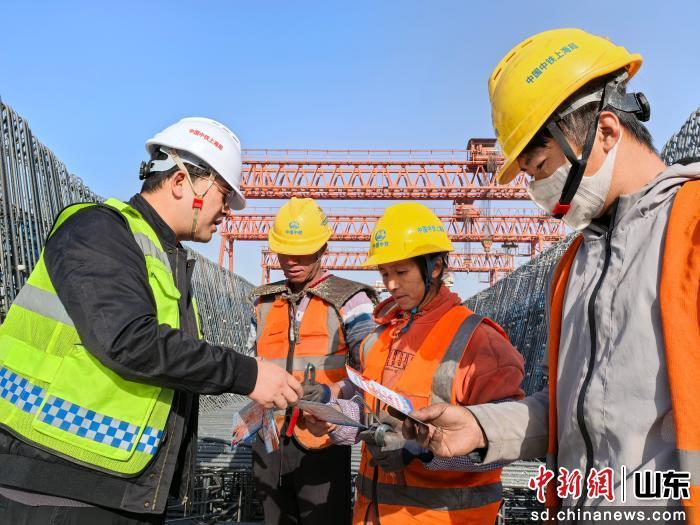 中新网山东新闻11月28日电(姚庆国)“上班之前想一想,安全防护不能忘”。近日,在中铁上海局潍宿高铁郯城制梁场制梁区域,现场工人之间互相传唱着这样的安全顺口溜。这是该梁场为切实加强冬季现场施工安全,为农民工发放的安防“口袋书”中的内容。