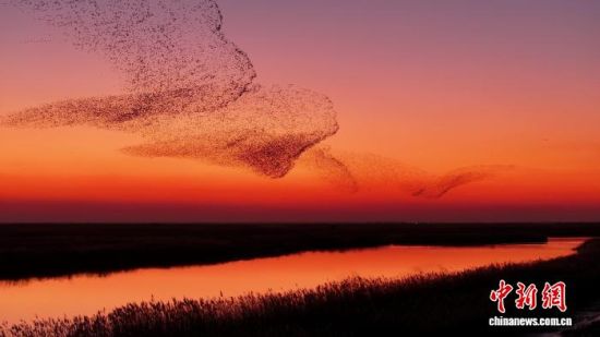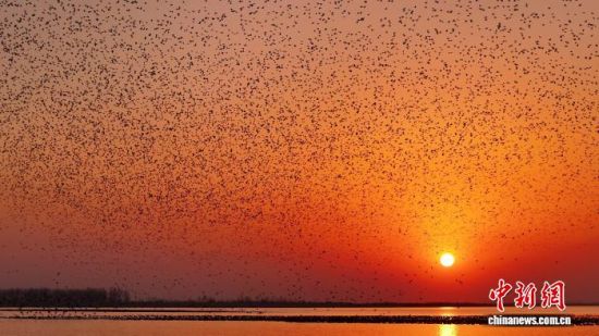 中新网东营12月5日电(周艺伟 沙见龙)冬季的山东黄河三角洲国家级自然保护区(简称“黄河三角洲保护区”),芦花似雪,落日熔金。湿地上空,万千候鸟翻飞成流动的“鸟浪”,奔涌万里的黄河在此静静汇入渤海。“视野开阔、鸟群翔集,景象十分震撼,能直观感受到生态环境在变好。”来自山东淄博的游客王耀敏说。