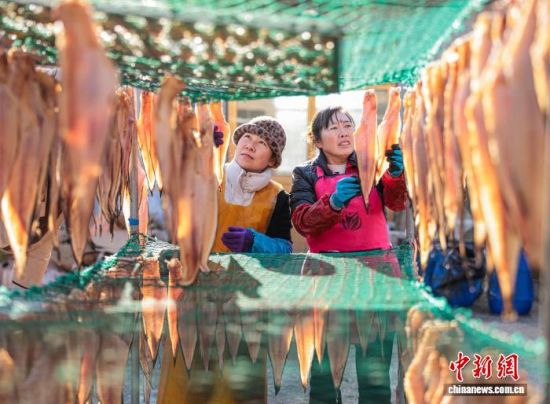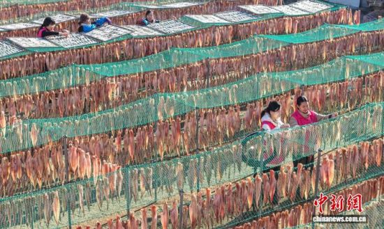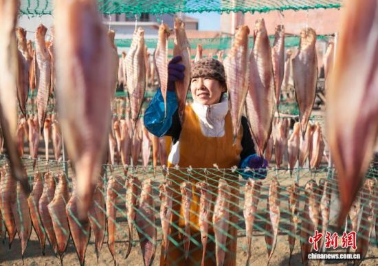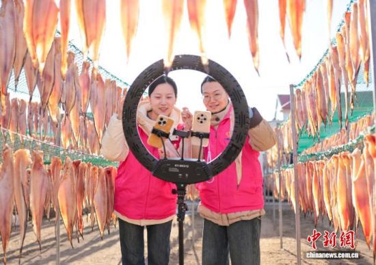 12月5日,在山东省荣成市石岛管理区的一个渔家院落,晾晒鱼干与直播带货同时进行。镜头前的“回水咸鱼干”传承当地千年制作技艺,如今借助直播飘香远方。李信君 摄