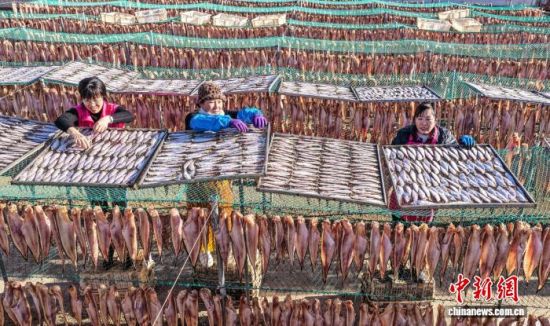 12月5日,在山东省荣成市石岛管理区的一个渔家院落,晾晒鱼干与直播带货同时进行。镜头前的“回水咸鱼干”传承当地千年制作技艺,如今借助直播飘香远方。(无人机照片)李信君 摄