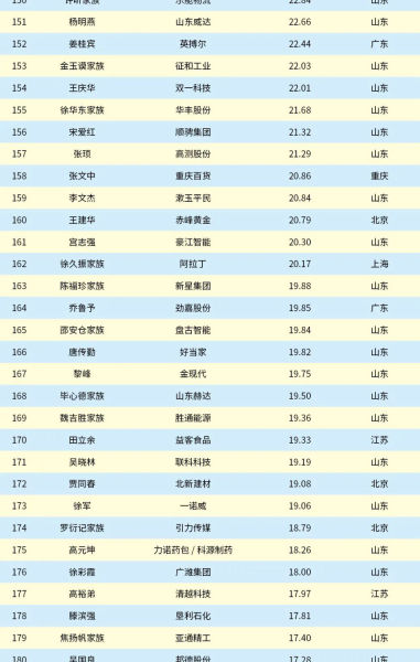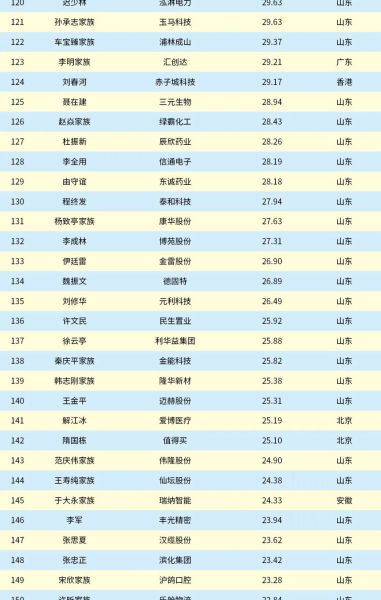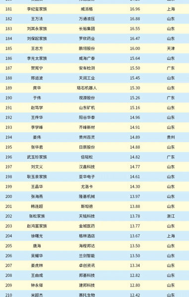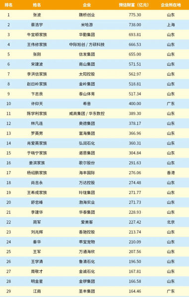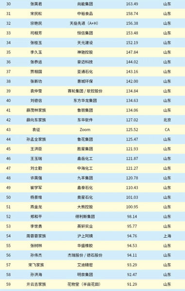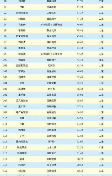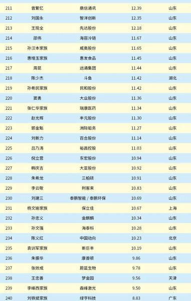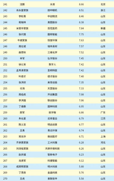 此外,榜单前十还包括华勤集团的牛宜顺家族、中际旭创的王伟修家族、信发集团的张刚、南山集团的宋建波、太阳控股的李洪信家族、金岭集团的赵曰岭家族、泰山体育的卞志良和希音的许仰天,他们的财富估值均超过了400亿元。