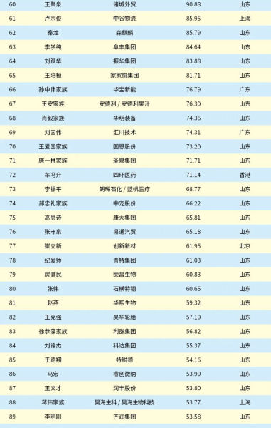 同时,榜单中亦有15位女性企业家上榜,共创造财富618.06亿元,成为鲁商群体的“她力量”。出生于1963年的简军,凭借医美企业爱美客创造财富227.42亿元,也是唯一的百亿级企业家。