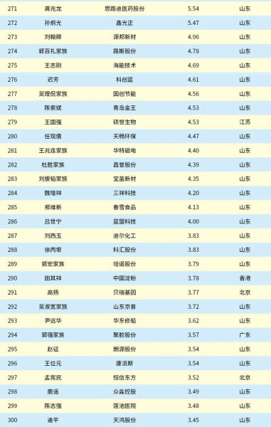 12月9日,由泰山财经出品的2025全球鲁商百富榜正式发布,300位山东籍企业家财富估值共计2.05万亿元,平均财富估值68.34亿元,上榜门槛3.45亿元。