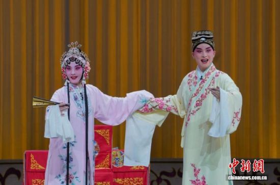 5月21日晚,第32届中国戏剧梅花奖在上海揭晓,尹春媛(左)和搭档在舞台上表演《玩会跳船》。山东省柳子剧团供图