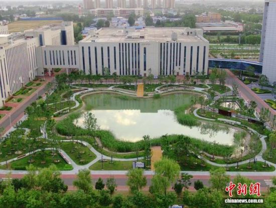 山东步长制药园区景观湖用于蓄水,喷淋池将雨水用于工业废水降温、循环再利用。菏泽鲁西新区办公室供图