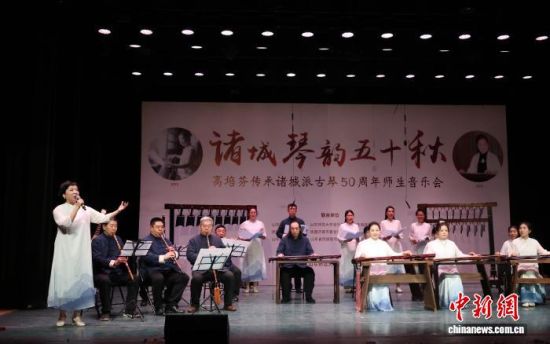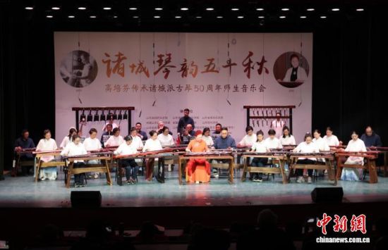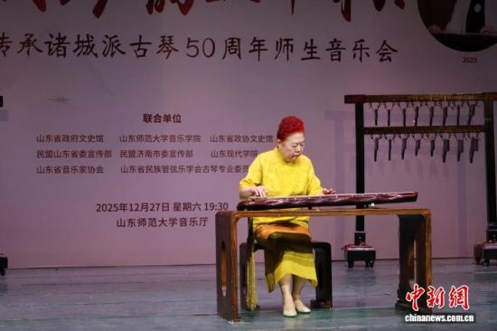中新网济南12月28日电(记者 赵晓)12月27日晚,伴随一曲古朴悠扬的《关山月》奏响,“诸城琴韵五十秋”——高培芬传承诸城派古琴50周年师生音乐会在山东师范大学(千佛山校区)音乐厅拉开帷幕。国家级非遗代表性项目诸城派古琴代表性传承人高培芬携30余名弟子同台献艺。