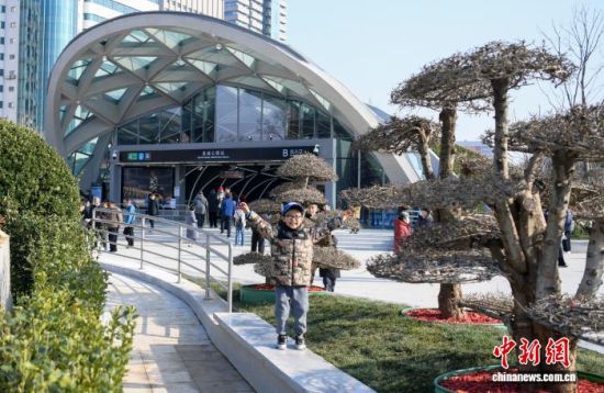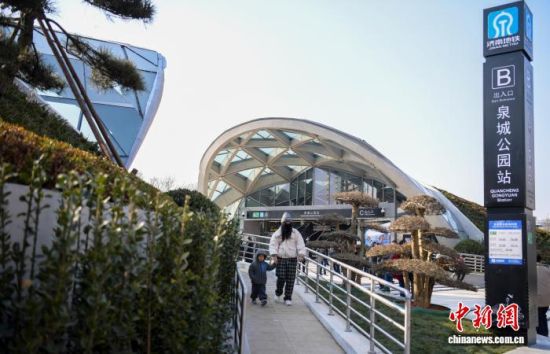 12月27日,市民在济南地铁泉城公园站前拍照。当日,山东济南地铁4号线、6号线东段及8号线正式开通运营,吸引许多市民纷纷踏上新开通的3段地铁线路,尽情体验地铁带来的出行便捷。中新社记者 张勇 摄
