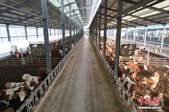 位于阳信县的亿利源5G牧场“智慧化牛舍”。(无人机照片)中新社记者 梁犇 摄