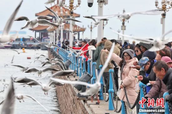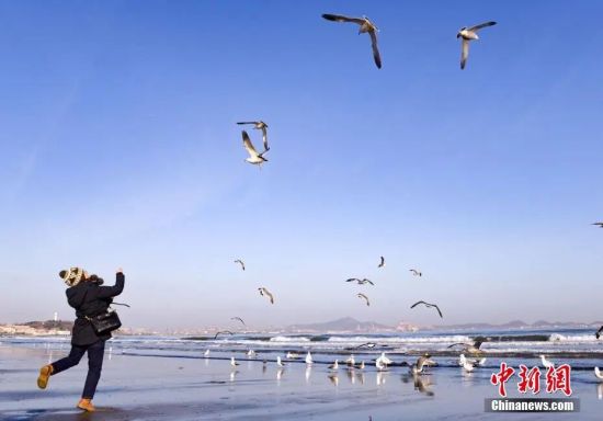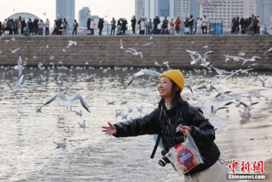 民众在烟台第一海水浴场海滨喂海鸥,成为冬日里一道独特风景。(资料图,王娇妮 摄)