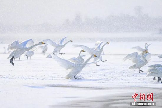 在山东荣成大天鹅国家级自然保护区,大天鹅在雪中飞翔,与白雪相映成趣。(资料图,李信君 摄)