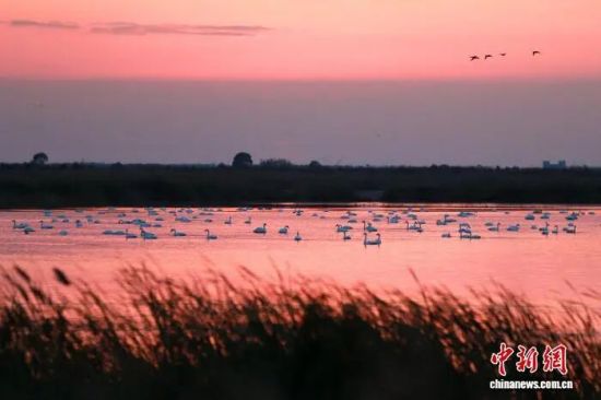 在东营黄河口湿地,一群天鹅在夕阳下栖息觅食。(资料图 梁犇 摄 )
