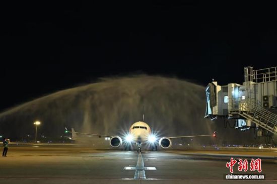 1月1日晚,青岛机场联合山东航空开通直飞越南胡志明市往返航线。图为该航线首班飞机通过“水门礼”。(山东航空供图)