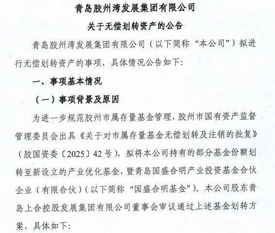近日,青岛胶州湾发展集团有限公司(下称“青岛胶州湾发展集团”)发布关于无偿划转资产的公告。
