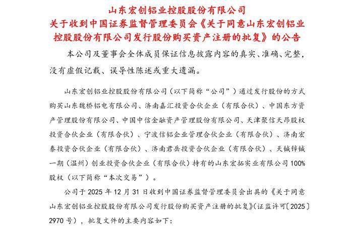 近日,山东魏桥创业集团有限公司(简称“魏桥集团”)旗下上市公司山东宏创铝业控股股份有限公司(简称“宏创控股”)发布公告称,已收到中国证券监督管理委员会出具的《关于同意山东宏创铝业控股股份有限公司发行股份购买资产注册的批复》。