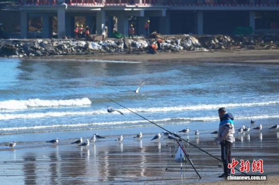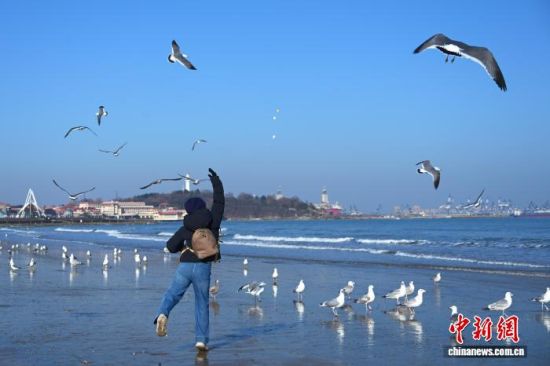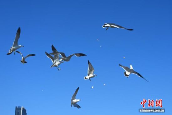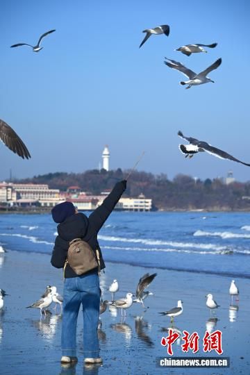 1月8日,山东烟台海滨,成群的海鸥在空中盘旋,与岸边观赏喂食的游客近距离互动,为冬日海岸增添生机与暖意。曲正扬 摄