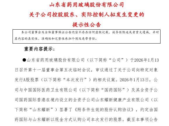 近日,国内药用玻璃行业龙头企业山东省药用玻璃股份有限公司(简称“山东药玻”)发布提示性公告,披露控股股东及实际控制人拟发生重大变更。