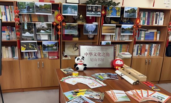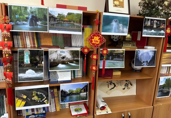 与书籍相映成趣的,是悬挂在书屋四周的20余幅中国书画作品。趵突泉的奔腾不息、黑虎泉的雄浑气势、月牙泉的静谧……一系列精美照片将“泉城”济南的自然景观与人文风貌生动呈现于国际友人面前。