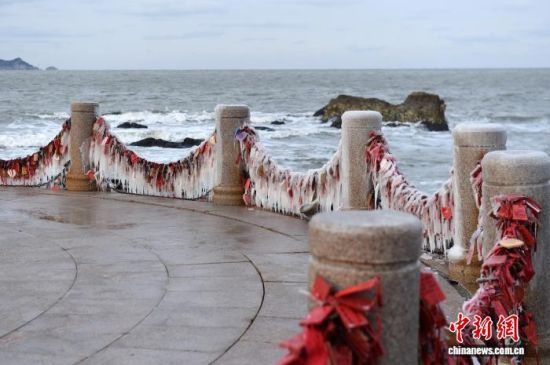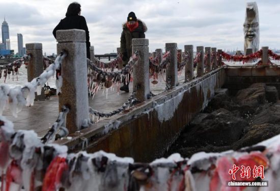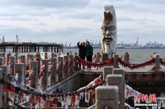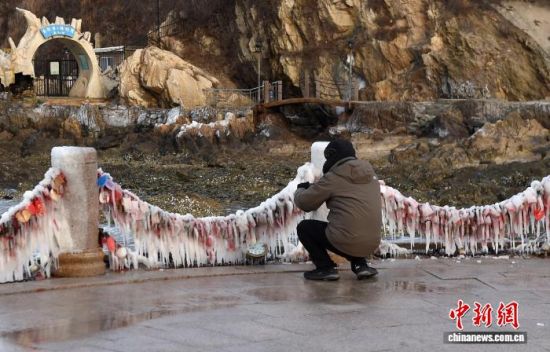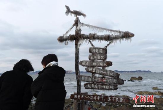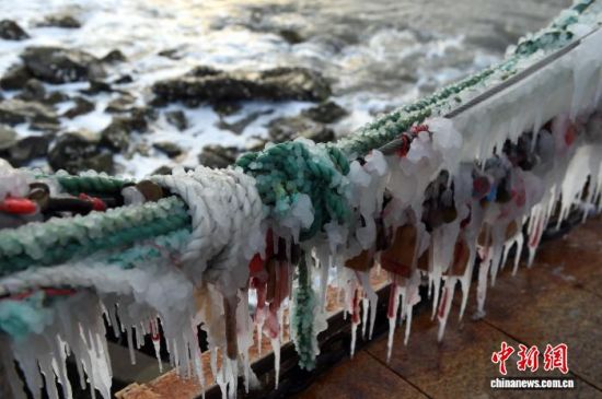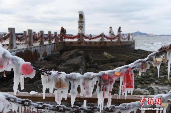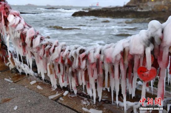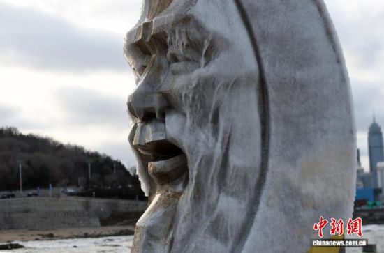 2月6日,山东烟台月亮湾景区,受低温与海风共同影响,月亮老人雕塑、临海护栏凝上冰层,海岸被冰妆点,别有一番冬日景致。王娇妮 摄
