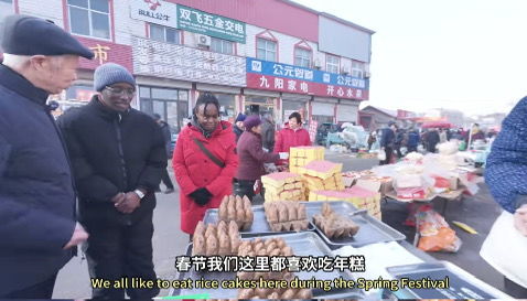 沿着集市前行,外籍友人们被刚出锅的粘窝窝和年糕吸引。冒着热气的传统年节食品让他们既好奇又期待。在摊主的热情邀请下,莉亚小心地品尝了一小块年糕,“甜甜的、黏黏的,很特别的口感!”她笑着说,这是她第一次知道中国新年要吃这种食物。