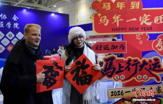 2月6日,山东济南,外国友人手持“福”字在年货会上拍照。当日,2026山东新春年货会在山东国际会展中心开幕。本届年货会“以齐鲁好品贺新春,国潮惠民中国年”为主题,为市民打造一场集品质、实惠、便捷于一体的新春消费盛宴。中新社记者 张勇 摄