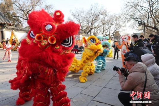 孔府门前的舞狮表演吸引观众观看。赵晓 摄
