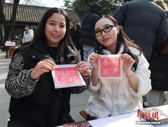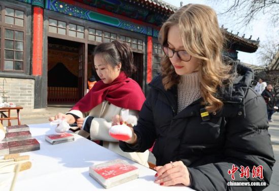 外国留学生在孔府体验朱砂拓印。赵晓 摄